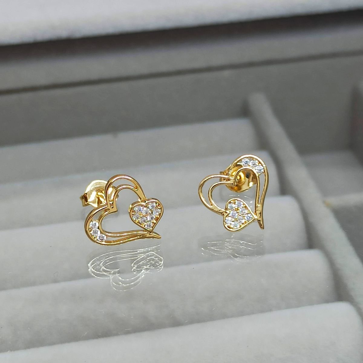 Brinco folheado a ouro de corações vazados cravejados em micro zircônias brancas.
