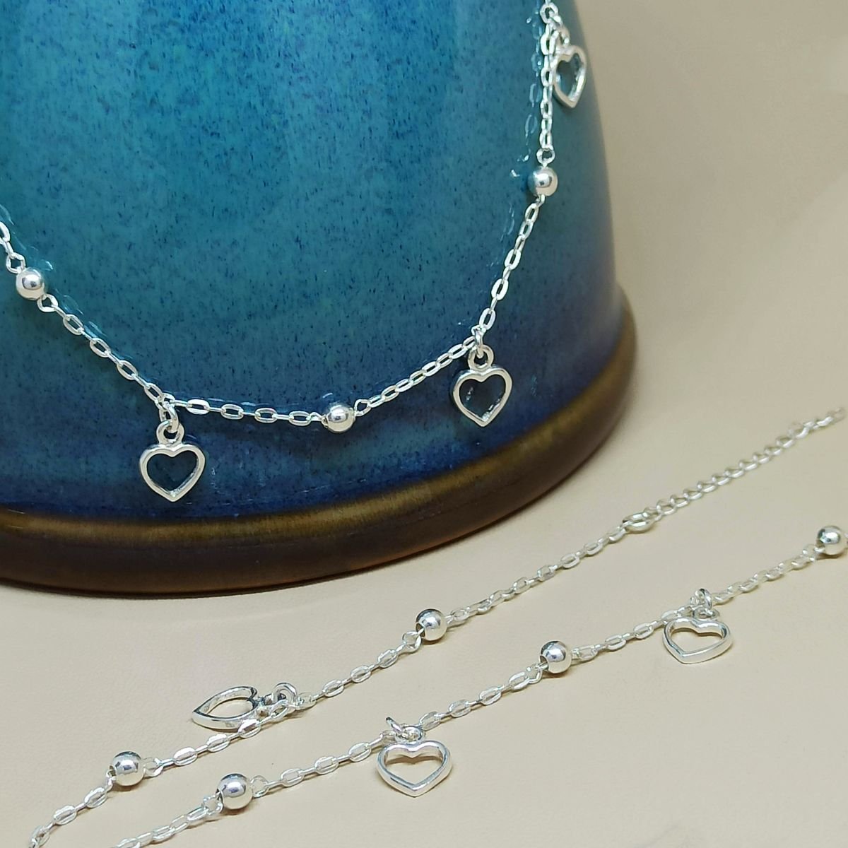 Tornozeleira de prata de bolinha com pingentes de coração